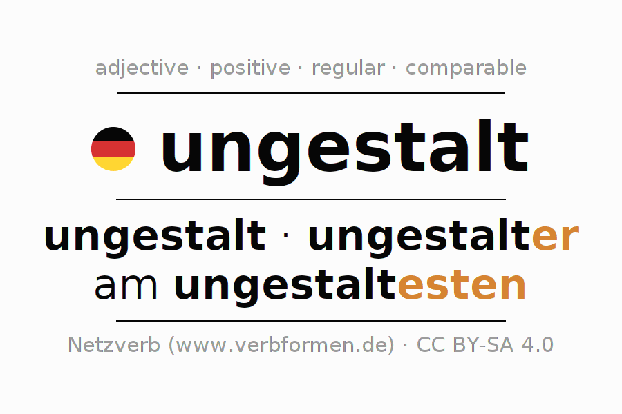 The declension of the adjective ungestalt (formless, shapeless) uses these forms of the comparison ungestalt,ungestalter,am ungestaltesten. The endings for the comparison in the comparative and superlative are er/esten. The adjective ungestalt can be used both attributively in front of a noun as well as predicative in conjunction with a verb.One can not only inflect and compare ungestalt, but all German adjectives. Comments ☆