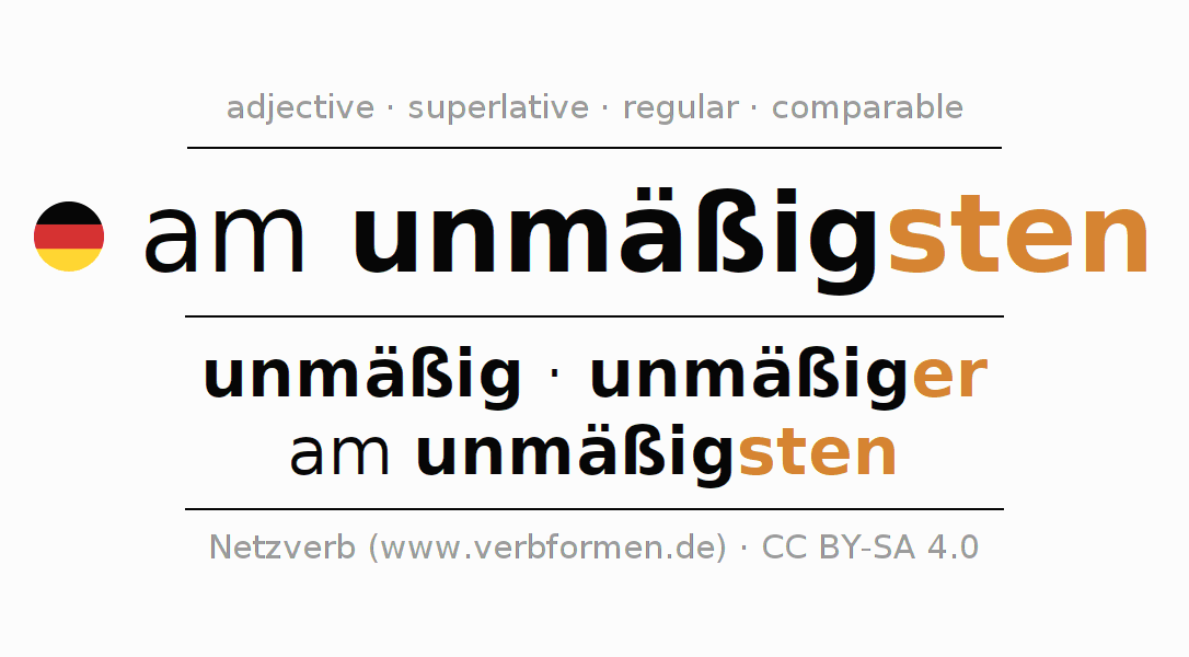 The declension of the adjective am unmäßigsten (excessive, immoderate) uses these forms of the comparison unmäßig,unmäßiger,am unmäßigsten. The endings for the comparison in the comparative and superlative are er/sten. The adjective am unmäßigsten can be used both attributively in front of a noun as well as predicative in conjunction with a verb.One can not only inflect and compare am unmäßigsten, but all German adjectives. Comments ☆