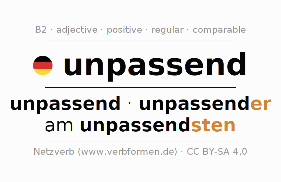 The declension of the adjective unpassend (inappropriate, improper) uses these forms of the comparison unpassend,unpassender,am unpassendsten. The endings for the comparison in the comparative and superlative are er/sten. The adjective unpassend can be used both attributively in front of a noun as well as predicative in conjunction with a verb.One can not only inflect and compare unpassend, but all German adjectives. Comments ☆