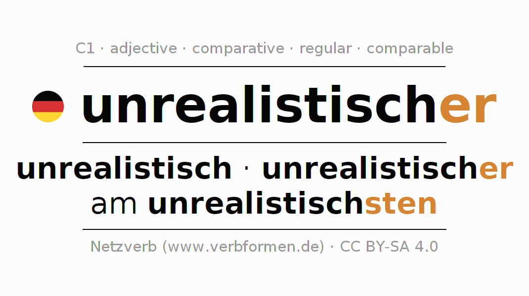 The declension of the adjective unrealistischer (impractical, unreal) uses these forms of the comparison unrealistisch,unrealistischer,am unrealistischsten. The endings for the comparison in the comparative and superlative are er/sten. The adjective unrealistischer can be used both attributively in front of a noun as well as predicative in conjunction with a verb.One can not only inflect and compare unrealistischer, but all German adjectives. Comments ☆