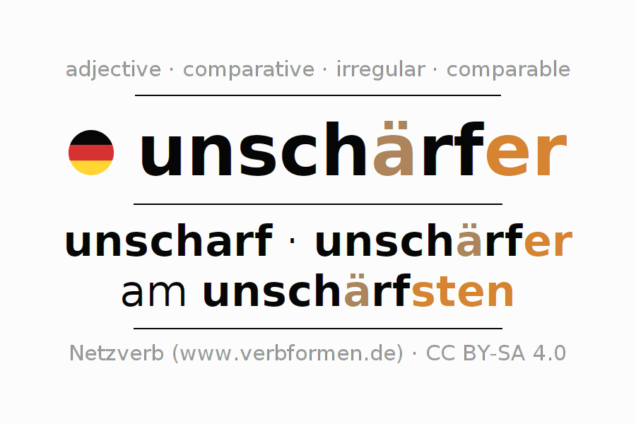 The declension of the adjective unschärfer (blurry, fuzzy) uses these forms of the comparison unscharf,unschärfer,am unschärfsten. The endings for the comparison in the comparative and superlative are ä-er/ä-sten. The adjective unschärfer can be used both attributively in front of a noun as well as predicative in conjunction with a verb.One can not only inflect and compare unschärfer, but all German adjectives. Comments ☆