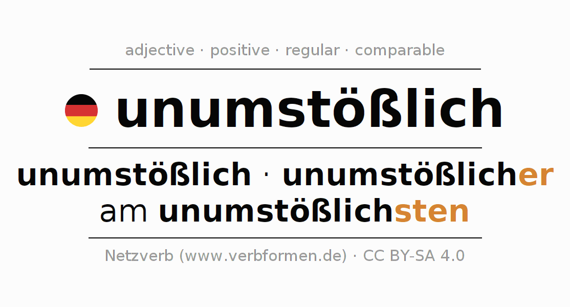 The declension of the adjective unumstößlich (irrevocable, immutable) uses these forms of the comparison unumstößlich,unumstößlicher,am unumstößlichsten. The endings for the comparison in the comparative and superlative are er/sten. The adjective unumstößlich can be used both attributively in front of a noun as well as predicative in conjunction with a verb.One can not only inflect and compare unumstößlich, but all German adjectives. Comments ☆