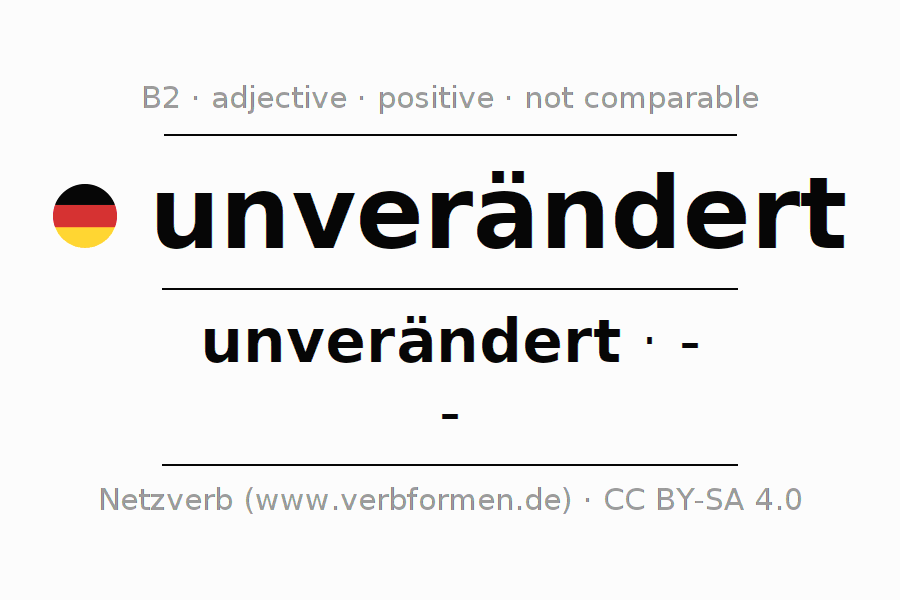 The declension of the adjective unverändert (unchanged, unmodified) uses the incomparable form unverändert. The adjective has no forms for the comparative and superlative. The adjective unverändert can be used both attributively in front of a noun as well as predicative in conjunction with a verb.One can not only inflect and compare unverändert, but all German adjectives. Comments ☆