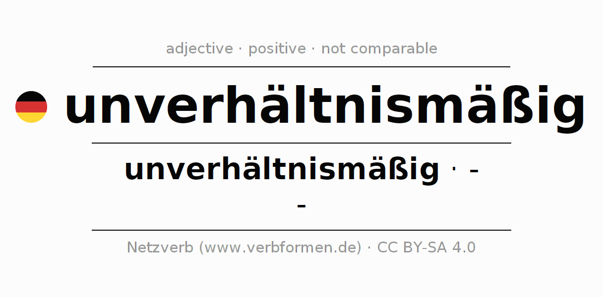 The declension of the adjective unverhältnismäßig (excessive, disproportionate) uses the incomparable form unverhältnismäßig. The adjective has no forms for the comparative and superlative. The adjective unverhältnismäßig can be used both attributively in front of a noun as well as predicative in conjunction with a verb.One can not only inflect and compare unverhältnismäßig, but all German adjectives. Comments ☆