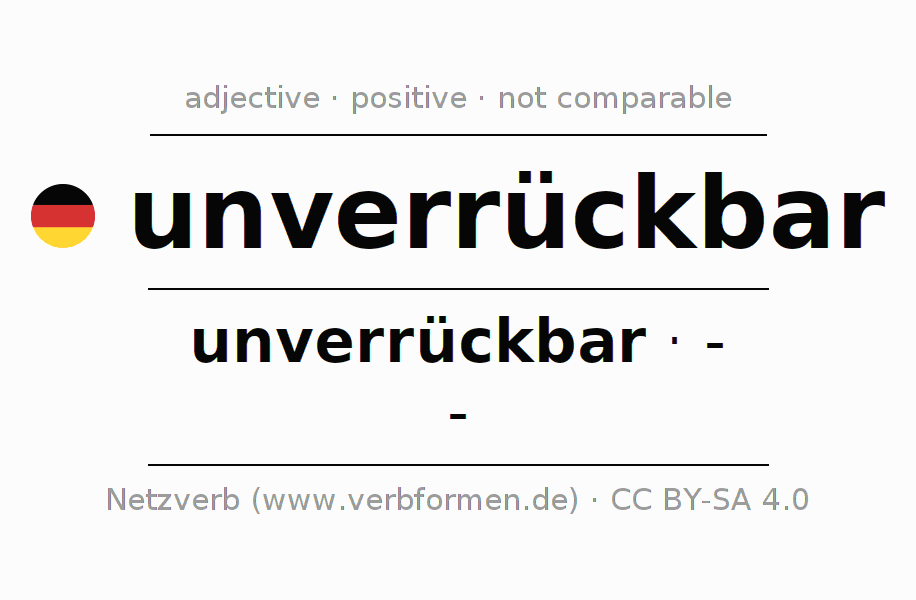 The declension of the adjective unverrückbar (immovable, fixed) uses the incomparable form unverrückbar. The adjective has no forms for the comparative and superlative. The adjective unverrückbar can be used both attributively in front of a noun as well as predicative in conjunction with a verb.One can not only inflect and compare unverrückbar, but all German adjectives. Comments ☆