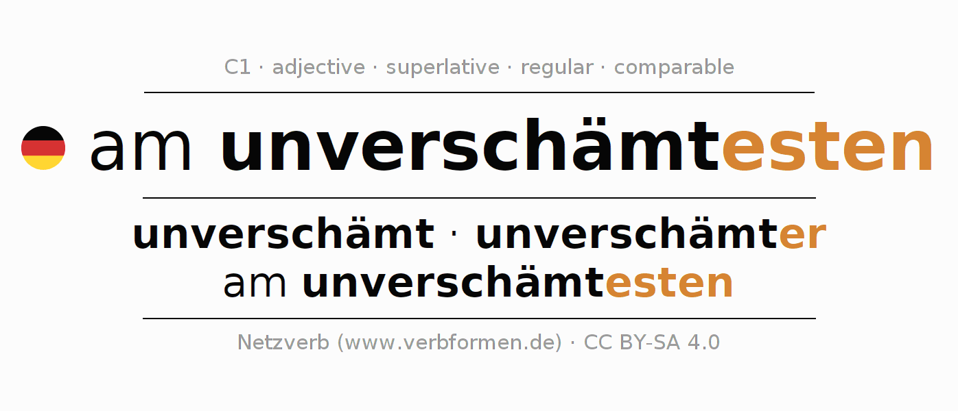 The declension of the adjective am unverschämtesten (shameless, outrageous) uses these forms of the comparison unverschämt,unverschämter,am unverschämtesten. The endings for the comparison in the comparative and superlative are er/esten. The adjective am unverschämtesten can be used both attributively in front of a noun as well as predicative in conjunction with a verb.One can not only inflect and compare am unverschämtesten, but all German adjectives. Comments ☆