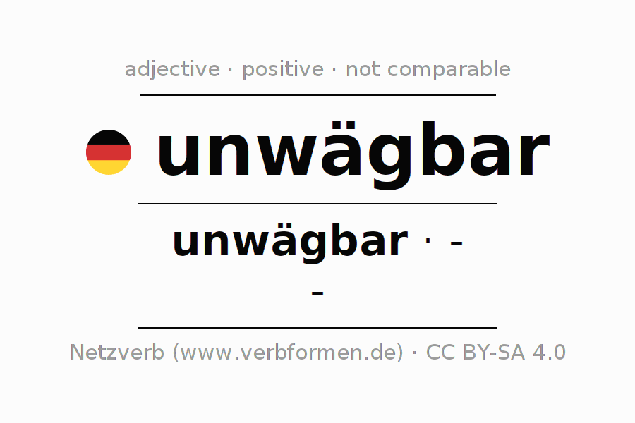The declension of the adjective unwägbar (immeasurable, incomparable) uses the incomparable form unwägbar. The adjective has no forms for the comparative and superlative. The adjective unwägbar can be used both attributively in front of a noun as well as predicative in conjunction with a verb.One can not only inflect and compare unwägbar, but all German adjectives. Comments ☆