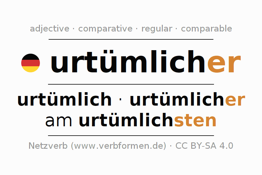 The declension of the adjective urtümlicher (ancient, original) uses these forms of the comparison urtümlich,urtümlicher,am urtümlichsten. The endings for the comparison in the comparative and superlative are er/sten. The adjective urtümlicher can be used both attributively in front of a noun as well as predicative in conjunction with a verb.One can not only inflect and compare urtümlicher, but all German adjectives. Comments ☆