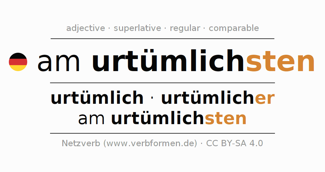 The declension of the adjective am urtümlichsten (ancient, original) uses these forms of the comparison urtümlich,urtümlicher,am urtümlichsten. The endings for the comparison in the comparative and superlative are er/sten. The adjective am urtümlichsten can be used both attributively in front of a noun as well as predicative in conjunction with a verb.One can not only inflect and compare am urtümlichsten, but all German adjectives. Comments ☆