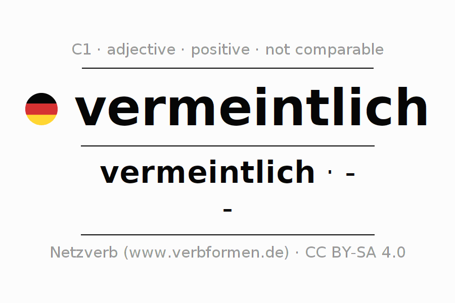 The declension of the adjective vermeintlich (alleged, presumed) uses the incomparable form vermeintlich. The adjective has no forms for the comparative and superlative. The adjective vermeintlich can be used both attributively in front of a noun as well as predicative in conjunction with a verb.One can not only inflect and compare vermeintlich, but all German adjectives. Comments ☆