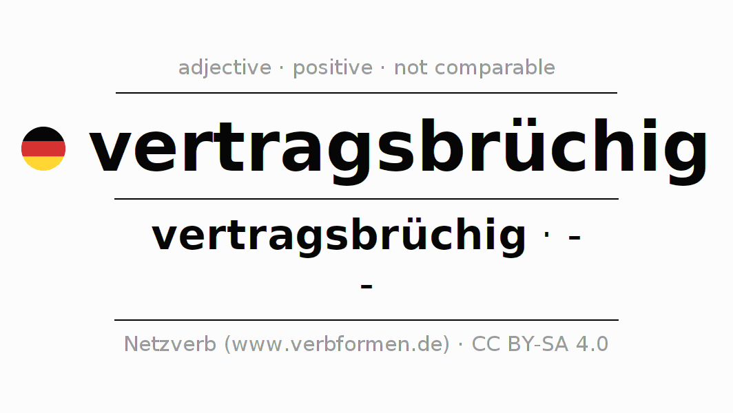 The declension of the adjective vertragsbrüchig (breach of contract, contract-breaking) uses the incomparable form vertragsbrüchig. The adjective has no forms for the comparative and superlative. The adjective vertragsbrüchig can be used both attributively in front of a noun as well as predicative in conjunction with a verb.One can not only inflect and compare vertragsbrüchig, but all German adjectives. Comments ☆