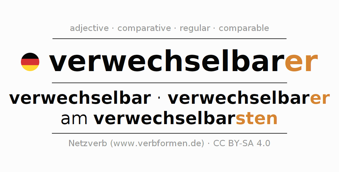 The declension of the adjective verwechselbarer (confusable, interchangeable) uses these forms of the comparison verwechselbar,verwechselbarer,am verwechselbarsten. The endings for the comparison in the comparative and superlative are er/sten. The adjective verwechselbarer can be used both attributively in front of a noun as well as predicative in conjunction with a verb.One can not only inflect and compare verwechselbarer, but all German adjectives. Comments ☆