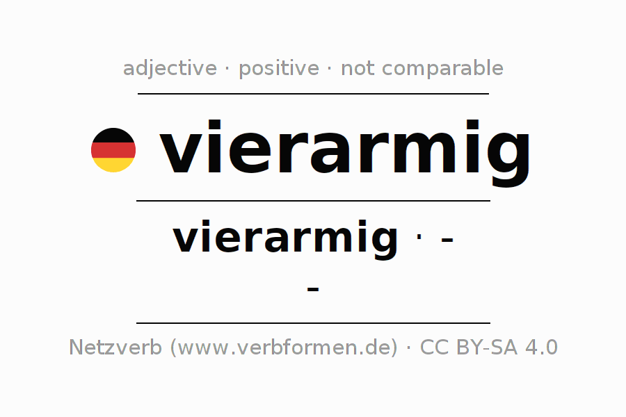 The declension of the adjective vierarmig (four-armed) uses the incomparable form vierarmig. The adjective has no forms for the comparative and superlative. The adjective vierarmig can be used both attributively in front of a noun as well as predicative in conjunction with a verb.One can not only inflect and compare vierarmig, but all German adjectives. Comments ☆