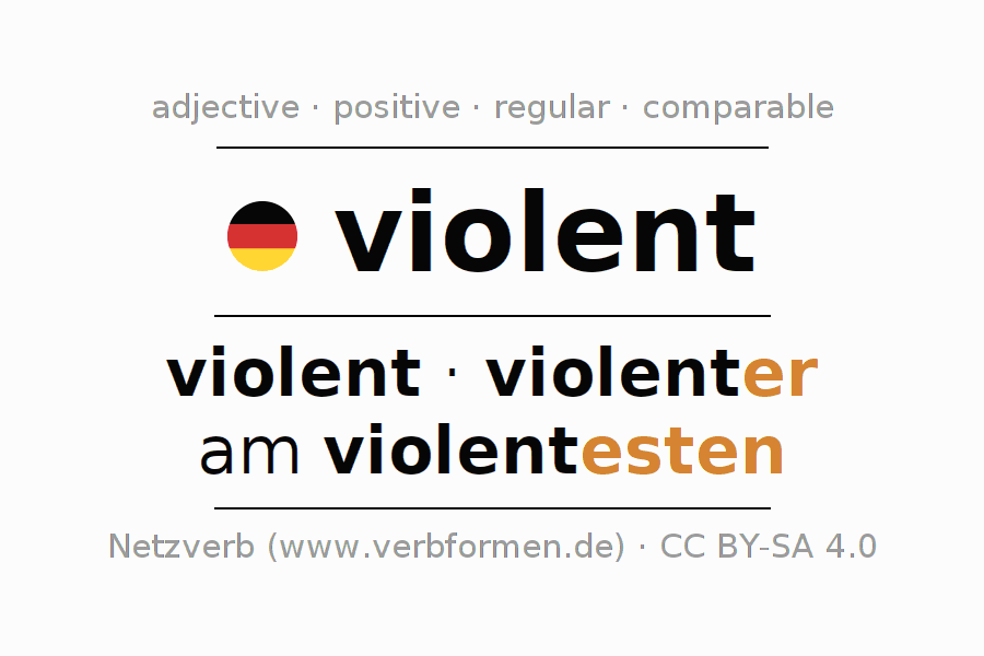 The declension of the adjective violent uses these forms of the comparison violent,violenter,am violentesten. The endings for the comparison in the comparative and superlative are er/esten. The adjective violent can be used both attributively in front of a noun as well as predicative in conjunction with a verb.One can not only inflect and compare violent, but all German adjectives. Comments ☆