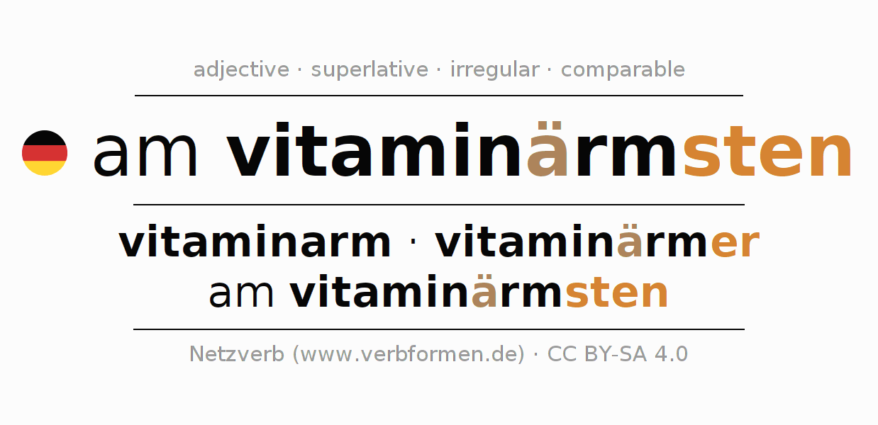 The declension of the adjective am vitaminärmsten (low in vitamins, vitamin-poor) uses these forms of the comparison vitaminarm,vitaminärmer,am vitaminärmsten. The endings for the comparison in the comparative and superlative are ä-er/ä-sten. The adjective am vitaminärmsten can be used both attributively in front of a noun as well as predicative in conjunction with a verb.One can not only inflect and compare am vitaminärmsten, but all German adjectives. Comments ☆