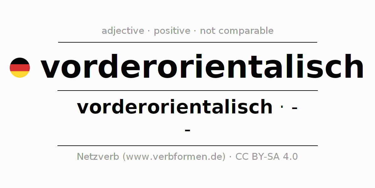 The declension of the adjective vorderorientalisch (Near Eastern) uses the incomparable form vorderorientalisch. The adjective has no forms for the comparative and superlative. The adjective vorderorientalisch can be used both attributively in front of a noun as well as predicative in conjunction with a verb.One can not only inflect and compare vorderorientalisch, but all German adjectives. Comments ☆