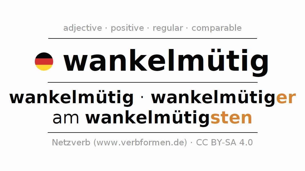 The declension of the adjective wankelmütig (fickle, inconstant) uses these forms of the comparison wankelmütig,wankelmütiger,am wankelmütigsten. The endings for the comparison in the comparative and superlative are er/sten. The adjective wankelmütig can be used both attributively in front of a noun as well as predicative in conjunction with a verb.One can not only inflect and compare wankelmütig, but all German adjectives. Comments ☆