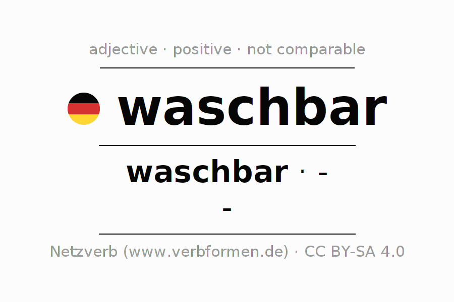 The declension of the adjective waschbar (washable) uses the incomparable form waschbar. The adjective has no forms for the comparative and superlative. The adjective waschbar can be used both attributively in front of a noun as well as predicative in conjunction with a verb.One can not only inflect and compare waschbar, but all German adjectives. Comments ☆