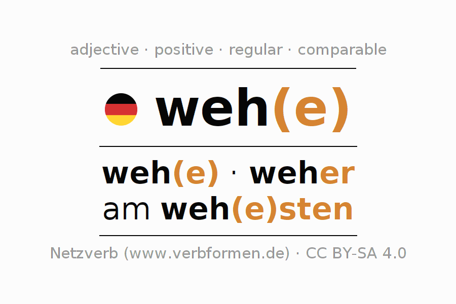 The declension of the adjective weh (painful, sore) uses these forms of the comparison weh,weher,am wehesten. The endings for the comparison in the comparative and superlative are er/esten. The adjective weh can be used both attributively in front of a noun as well as predicative in conjunction with a verb.One can not only inflect and compare weh, but all German adjectives. Comments ☆