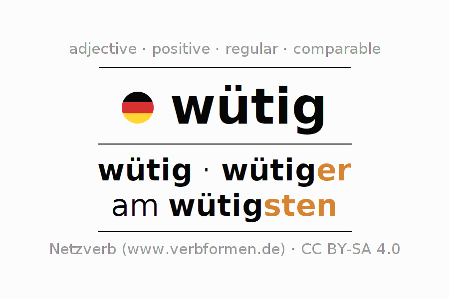 The declension of the adjective wütig (furious) uses these forms of the comparison wütig,wütiger,am wütigsten. The endings for the comparison in the comparative and superlative are er/sten. The adjective wütig can be used both attributively in front of a noun as well as predicative in conjunction with a verb.One can not only inflect and compare wütig, but all German adjectives. Comments ☆