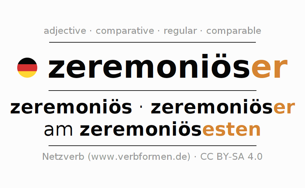The declension of the adjective zeremoniöser (ceremonious, ceremonial) uses these forms of the comparison zeremoniös,zeremoniöser,am zeremoniösesten. The endings for the comparison in the comparative and superlative are er/esten. The adjective zeremoniöser can be used both attributively in front of a noun as well as predicative in conjunction with a verb.One can not only inflect and compare zeremoniöser, but all German adjectives. Comments ☆