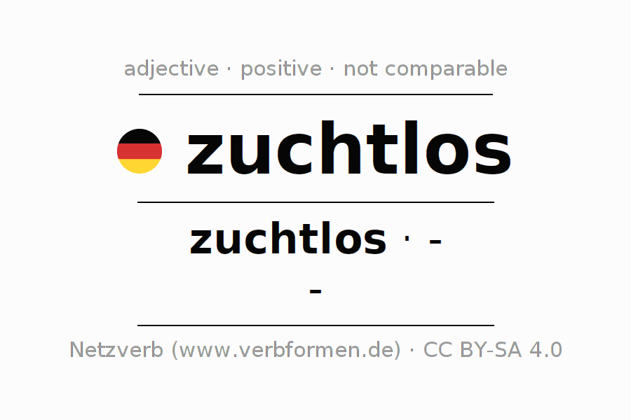The declension of the adjective zuchtlos (disorderly, undisciplined) uses the incomparable form zuchtlos. The adjective has no forms for the comparative and superlative. The adjective zuchtlos can be used both attributively in front of a noun as well as predicative in conjunction with a verb.One can not only inflect and compare zuchtlos, but all German adjectives. Comments ☆