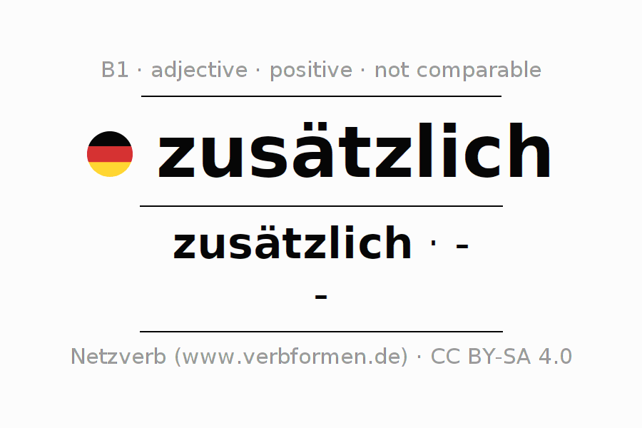 The declension of the adjective zusätzlich (additional, supplementary) uses the incomparable form zusätzlich. The adjective has no forms for the comparative and superlative. The adjective zusätzlich can be used both attributively in front of a noun as well as predicative in conjunction with a verb.One can not only inflect and compare zusätzlich, but all German adjectives. Comments ☆