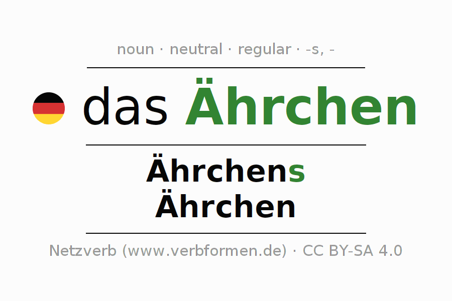 The declension of Ährchen as a table with all forms in singular (singular) and plural (plural) and in all four cases nominative (1st case), genitive (2nd case), dative (3rd case) and accusative (4th case). Especially for German learners the correct declension of the word Ährchen is crucial.