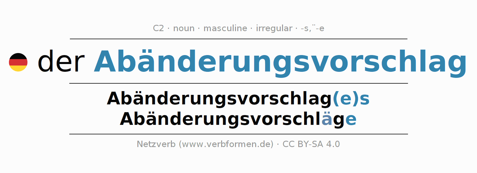 - Plural: die Abänderungsvorschläge, der Abänderungsvorschläge, den Abänderungsvorschlägen, die Abänderungsvorschläge