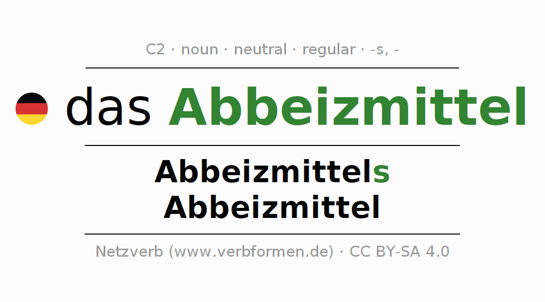 The declension of Abbeizmittel as a table with all forms in singular (singular) and plural (plural) and in all four cases nominative (1st case), genitive (2nd case), dative (3rd case) and accusative (4th case). Especially for German learners the correct declension of the word Abbeizmittel is crucial.