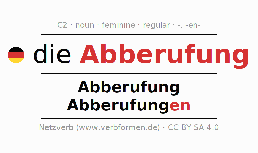 The declension of Abberufung as a table with all forms in singular (singular) and plural (plural) and in all four cases nominative (1st case), genitive (2nd case), dative (3rd case) and accusative (4th case). Especially for German learners the correct declension of the word Abberufung is crucial.