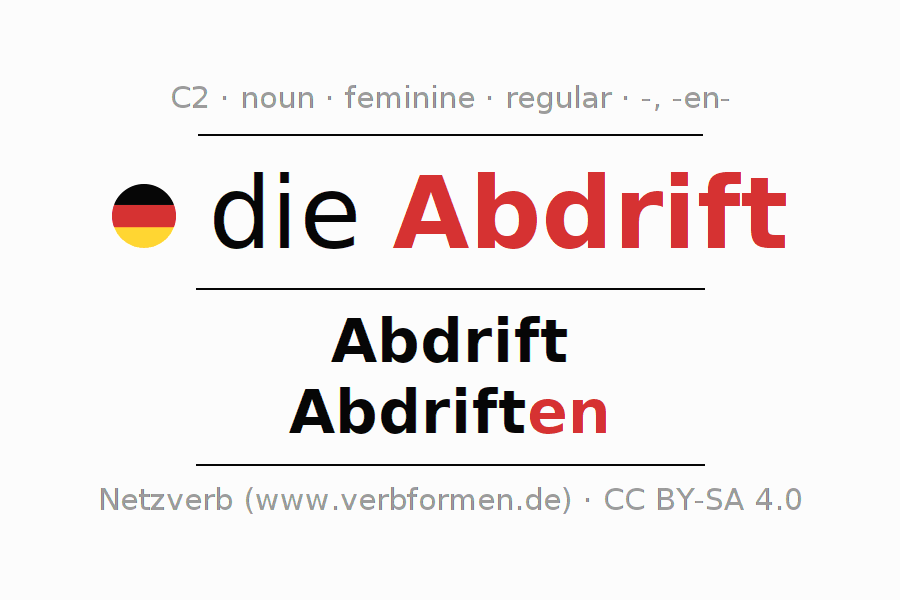 The declension of Abdrift as a table with all forms in singular (singular) and plural (plural) and in all four cases nominative (1st case), genitive (2nd case), dative (3rd case) and accusative (4th case). Especially for German learners the correct declension of the word Abdrift is crucial.