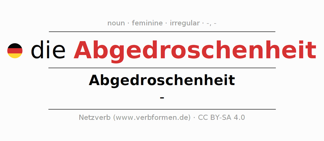 The declension of Abgedroschenheit as a table with all forms in singular (singular) and plural (plural) and in all four cases nominative (1st case), genitive (2nd case), dative (3rd case) and accusative (4th case). Especially for German learners the correct declension of the word Abgedroschenheit is crucial.