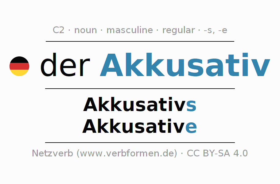 - Singular: der Akkusativ, des Akkusativs, dem Akkusativ, den Akkusativ