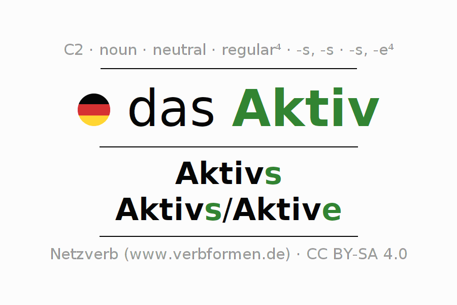 The declension of Aktiv as a table with all forms in singular (singular) and plural (plural) and in all four cases nominative (1st case), genitive (2nd case), dative (3rd case) and accusative (4th case). Especially for German learners the correct declension of the word Aktiv is crucial.