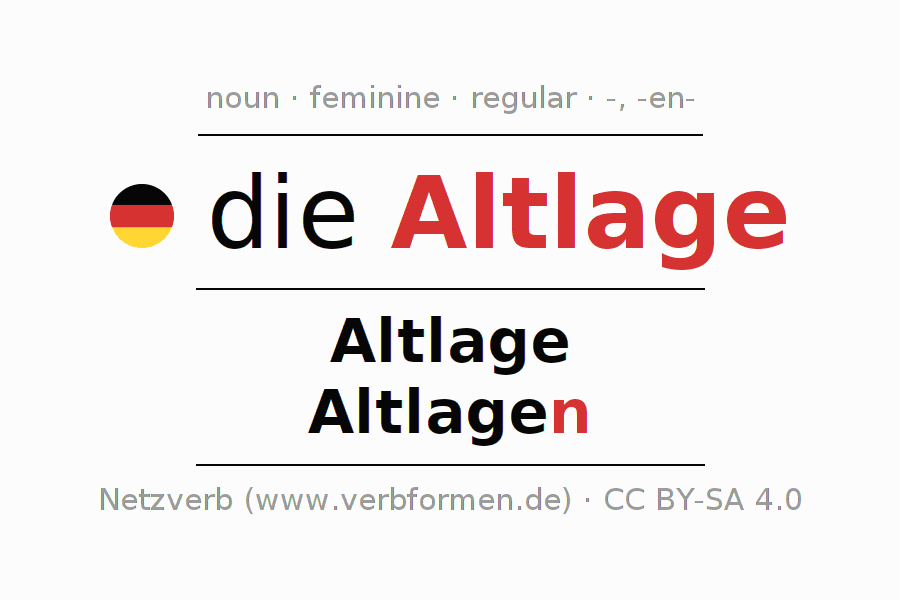 The declension of Altlage as a table with all forms in singular (singular) and plural (plural) and in all four cases nominative (1st case), genitive (2nd case), dative (3rd case) and accusative (4th case). Especially for German learners the correct declension of the word Altlage is crucial.
