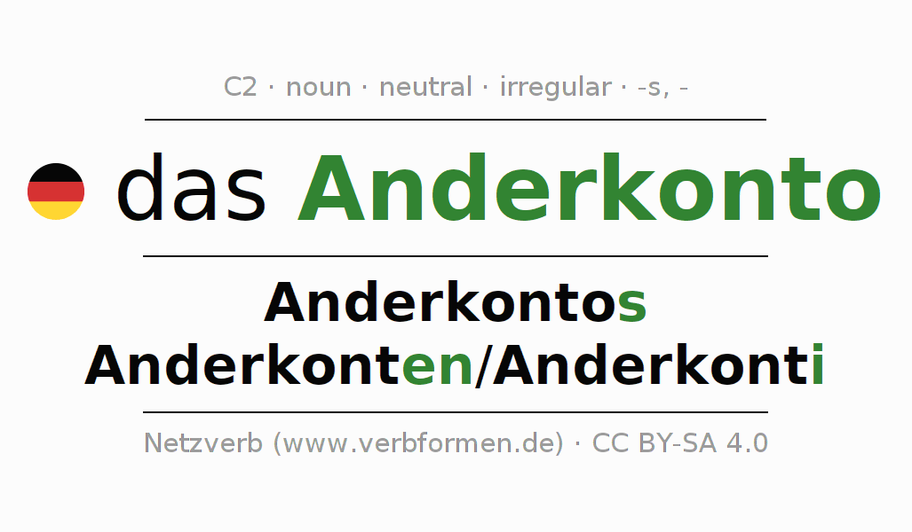 - Singular: das Anderkonto, des Anderkontos, dem Anderkonto, das Anderkonto