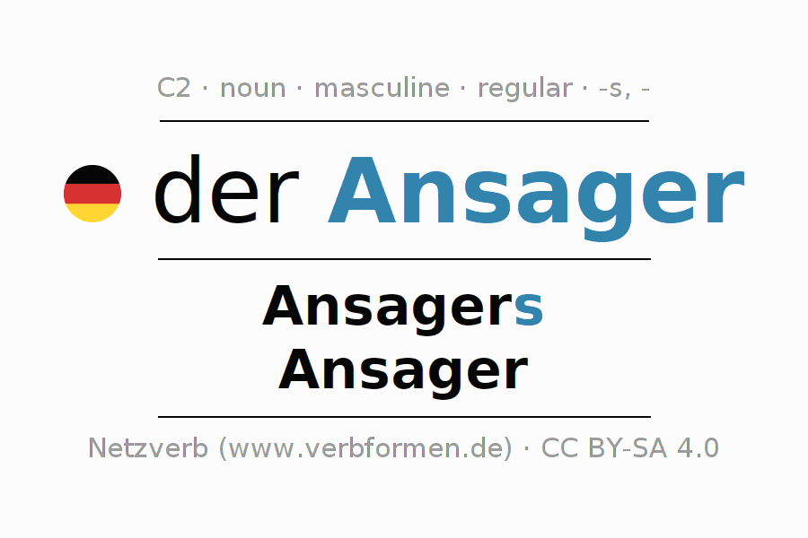- Singular: der Ansager, des Ansagers, dem Ansager, den Ansager