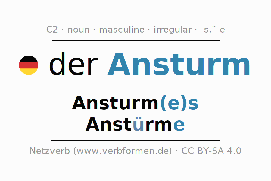 The declension of Ansturm as a table with all forms in singular (singular) and plural (plural) and in all four cases nominative (1st case), genitive (2nd case), dative (3rd case) and accusative (4th case). Especially for German learners the correct declension of the word Ansturm is crucial.