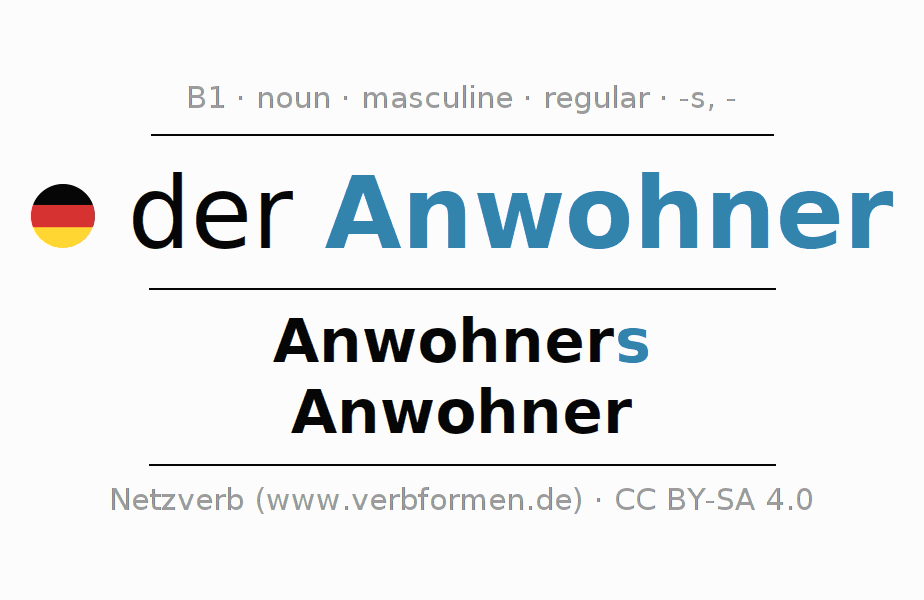 - Plural: die Anwohner, der Anwohner, den Anwohnern, die Anwohner