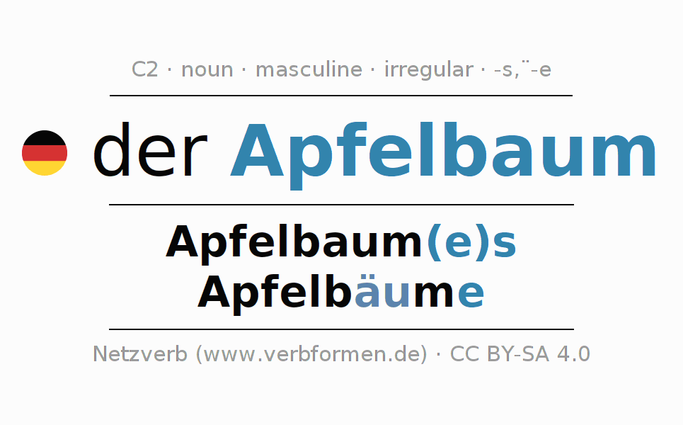 - Plural: die Apfelbäume, der Apfelbäume, den Apfelbäumen, die Apfelbäume