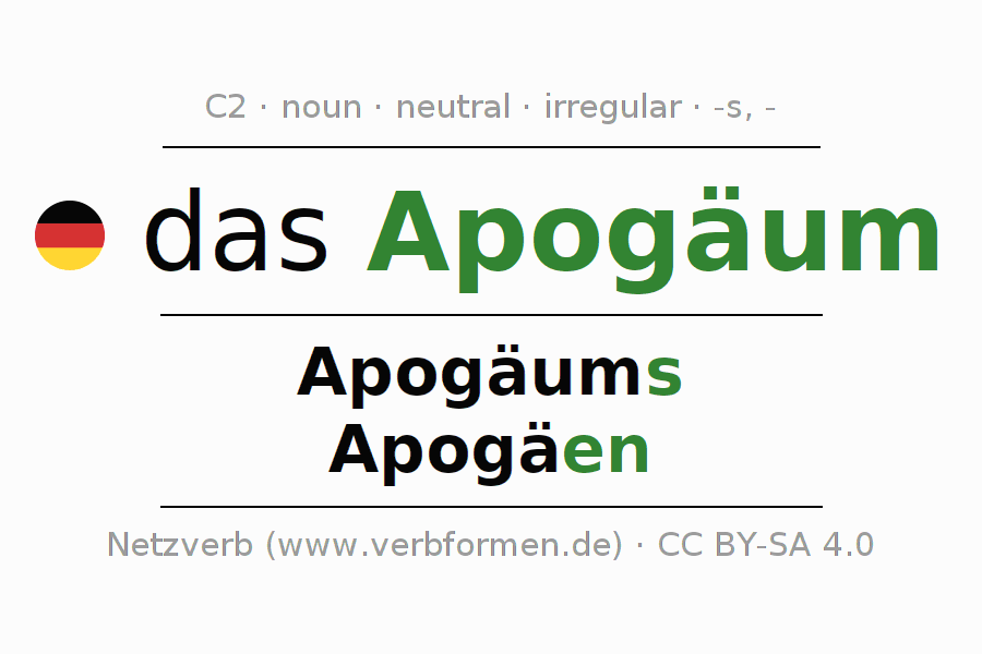 The declension of Apogäum as a table with all forms in singular (singular) and plural (plural) and in all four cases nominative (1st case), genitive (2nd case), dative (3rd case) and accusative (4th case). Especially for German learners the correct declension of the word Apogäum is crucial.