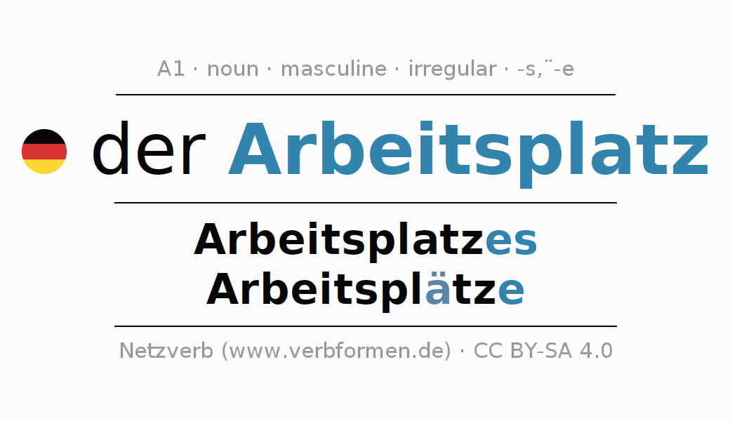 - Plural: die Arbeitsplätze, der Arbeitsplätze, den Arbeitsplätzen, die Arbeitsplätze