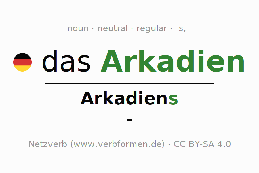 The declension of the noun Arkadien (Arcadia, idealized countryside) is in singular genitive Arkadiens and in the plural nominative -. The noun Arkadien is declined with the declension endings s/-. It does not form plurals. The voice of Arkadien is neutral and the article "das". Here you can not only inflect Arkadien but also all German nouns. Comments ☆