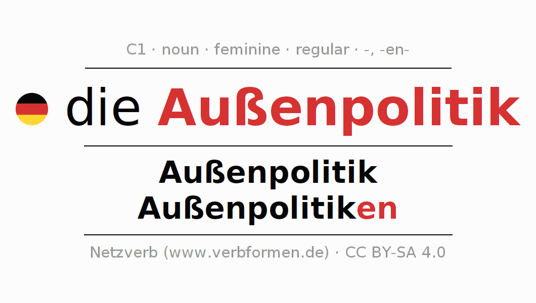 The declension of Außenpolitik as a table with all forms in singular (singular) and plural (plural) and in all four cases nominative (1st case), genitive (2nd case), dative (3rd case) and accusative (4th case). Especially for German learners the correct declension of the word Außenpolitik is crucial.