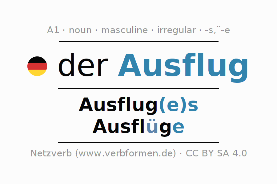 - Plural: die Ausflüge, der Ausflüge, den Ausflügen, die Ausflüge