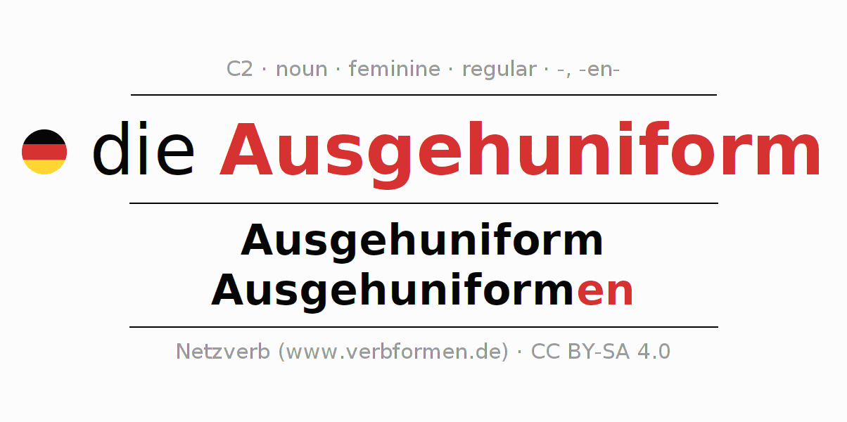 - Plural: die Ausgehuniformen, der Ausgehuniformen, den Ausgehuniformen, die Ausgehuniformen