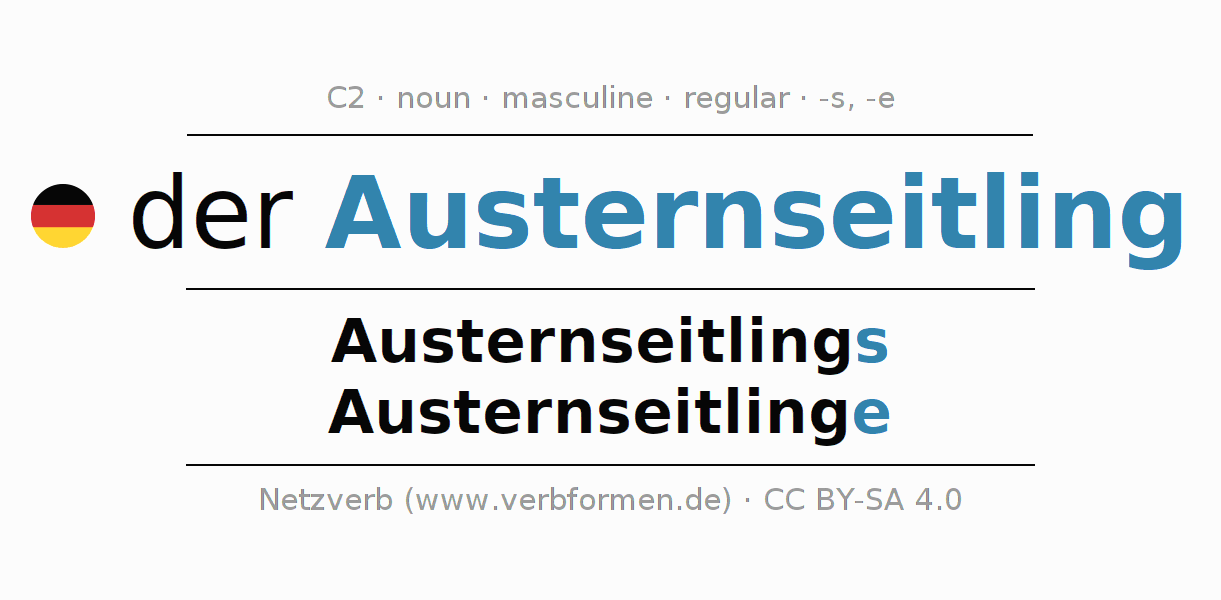 - Singular: der Austernseitling, des Austernseitlings, dem Austernseitling, den Austernseitling