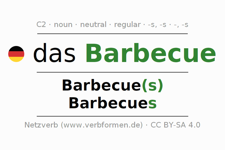 - Plural: die Barbecues, der Barbecues, den Barbecues, die Barbecues