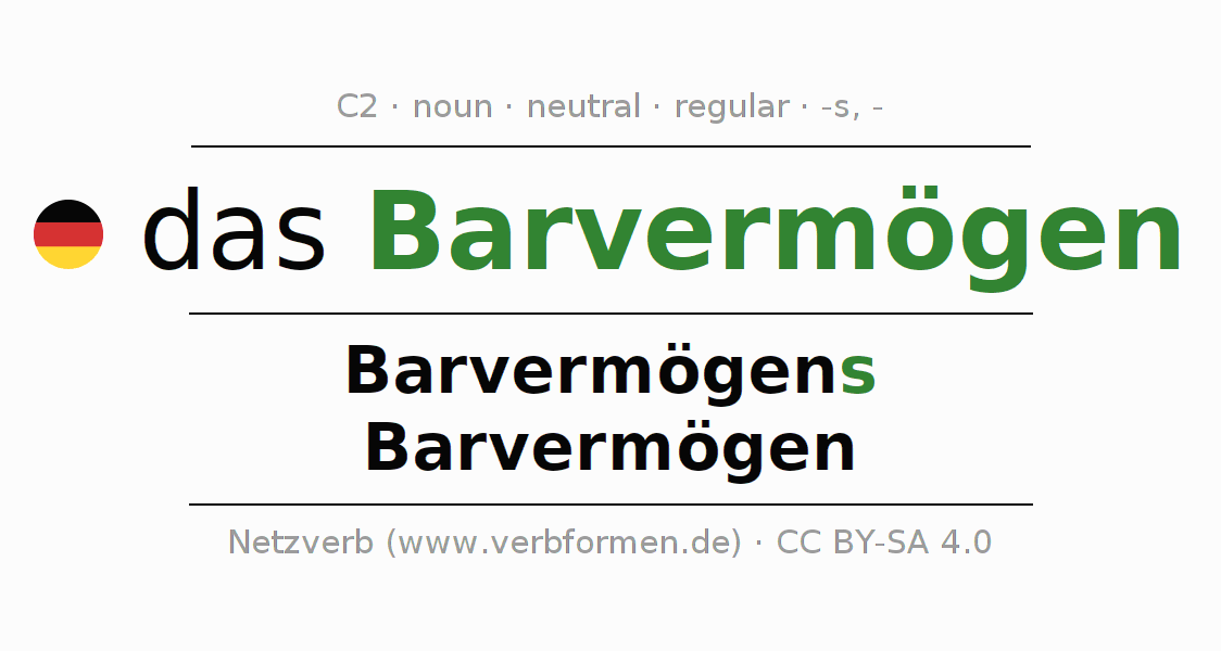 - Plural: die Barvermögen, der Barvermögen, den Barvermögen, die Barvermögen